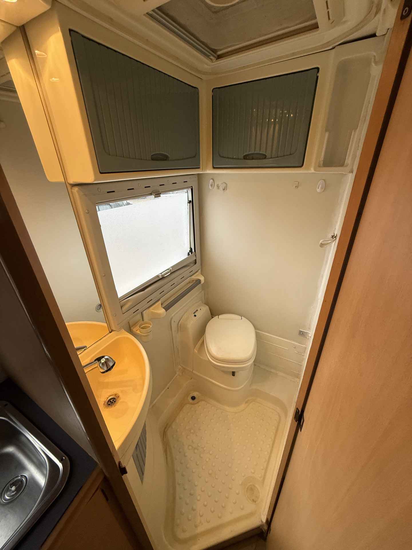 - Badkamer met douche, Thetford toilet, ruime wasgelegenheid en voldoende kastruimte.